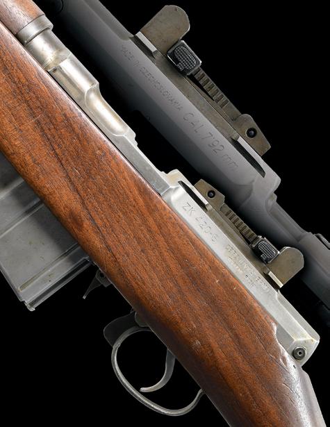scrolls and the head of a rabbit. Large scrolls continue onto frizzen guard. A band under pan is engraved “ANTO. ENGLISCH”. “In PRESPVRG” is behind cock. European walnut stock extends to muzzle and is pinned to barrel. Stock is relief carved with moldings around lock and other brass furniture and with scrolls around barrel tang. The gilded brass furniture is relief cast and chased with scrolls and hunting scenes and is quite fancy in outline. CONDITION: good. Iron and steel parts show cleaning to smooth silver gray. Engraving remains clear. Silver on barrel is toned. Stock is sound with stress crack on right side of grip and some repairs evident at muzzle with added sheet brass tip. Furniture retains about 20% gilding where protected. Ramrod is later replacement and has horn tip. Bore is pitted. Lock is fine. (01-25746/MGM). ANTIQUE. $2,000-3,000.