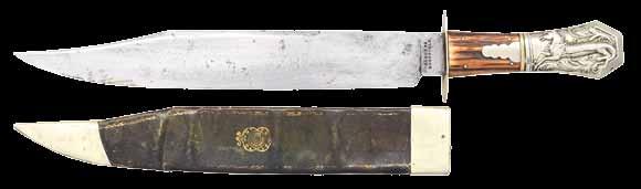 Overall length: 14 3/8”. Blade length: 8 3/4”. This knife could arguably be called a masterpiece. The overall impression of the knife’s function is overshadowed by its beautiful embellishments. The blade has a 5” beveled false edge and is marked at the ricasso “A.K. Daniels Town Creek, AL.” Steel elliptical crossguard with foliateengraved sides. Wooden coffin handle secured and decorated by 33 pins on each side. The ferrule panels above the guard are deeply engraved with similar foliate motifs. The center of the coffin handle has an elliptical insert on each side. One side has a scroll with the letters “J E L,” and the other side has matching foliate engraving. The pommel area of the knife has further foliate engraving and a tiny signature that reads “BB RN.” Leather sheath with matching mounts engraved with the exact same style foliate devices. The top mount has a large mushroom stud to aid in carrying the knife. CONDITION: the condition of this knife would be understated if we called it near mint. It is truly a superior example worthy of any