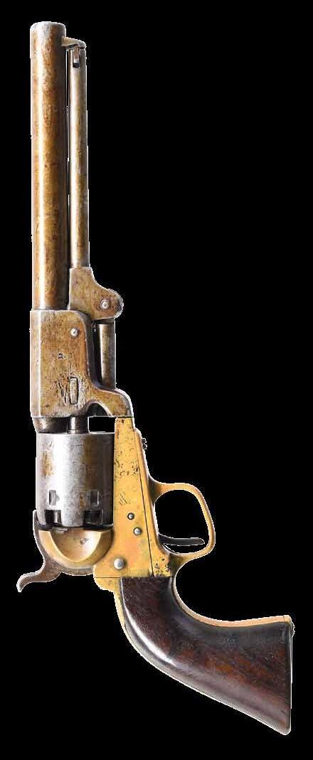 PERCUSSION CARBINE. Cal. 54. S#. 536. Mfg. by Mass. Arms, Chicopee Falls, MA. 2000 were produced under British contract in 1855. It is believed that most were destroyed before being sold as surplus. Bbl. 18” w/ multi sided grip forward of rear sight. Bbl. rotates & pivots to the right for loading. Semi circular front w/ graduated leaf rear sight. Brown finished bbl. w/ blued breech section & case colored lock & top tang. Lock is marked w/ crown over “VR”. Bbl. & frame has British proofs. Top tang has Greene’s patent marking. Walnut stock has iron patchbox & carbine buttplate. CONDITION: Bbl. has faded finish. Breech section as 50% blue showing fading & corrosion on left side. Lock has 50% light & fading case colors. Stock has age darkened appearance w/ dents & marks. Bright bore w/ strong rifling. PROVENANCE: ex-collection of Paul Eseppi. (01-25921/DS). $2000-3000.