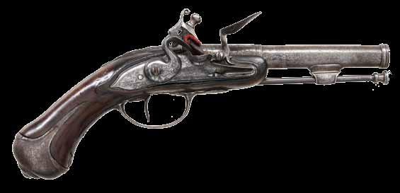 Cal. 50. NSN. Bbl. 6 3/4”. A fine early well-made French pistol appropriate for the French and Indian War, fur trade era, or the American Revolution. The pistol was made by Coulange of Somier in the south of France (now Sommieres), who worked from about 1760 to 1770. The semi-faceted to round barrel has hammered floral decoration throughout its entire length. The barrel tang is also embellished as well as the bolster area. The cock and the lock to the rear of the cock have similar engraved decoration. Under the faceted iron pan are the marks “Coulange a Somier”. The iron trigger guard, buttcap, and side plate are engraved with similar foliate decoration. There is an iron ramrod thimble and entry thimble, as well as the original iron ramrod. The stock appears to be fine-grained fruit wood and shows beautifully executed carved flourishes around the barrel tang and trigger guard. The side plate and ramrod channel are surrounded by similar carvings. CONDITION: the barrel and other iron show a pleasing, dark, early, uniform patina. The lock functions well and holds both full and half cock. The stock shows some splintering on the right side near the