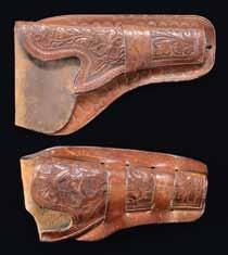 4463. PAIR OF WESTERN TOOLED HOLSTERS. Both holsters are unsigned. The single loop example stamped on verso “38 AUTO”. The double loop appears to fit Colt SAA 5.5” barrel. CONDITION: good to very good overall. PROVENANCE: Martin Lane Historic & Western Americana Lifetime Collection. (02-21602/JS). $400-600.