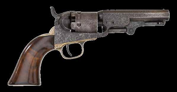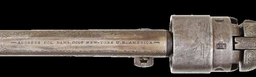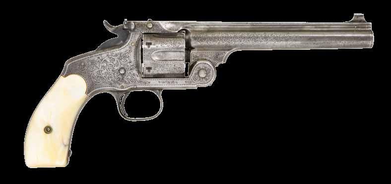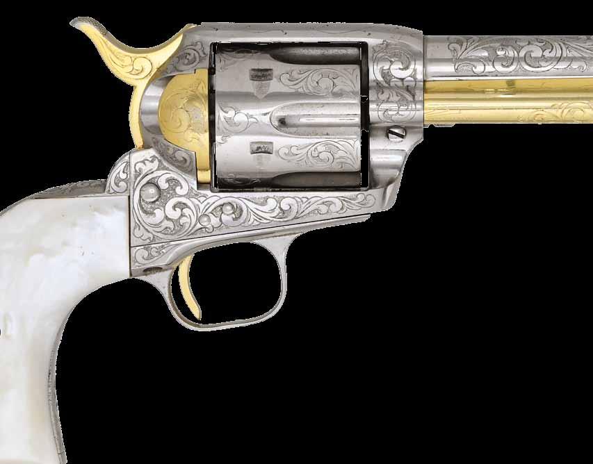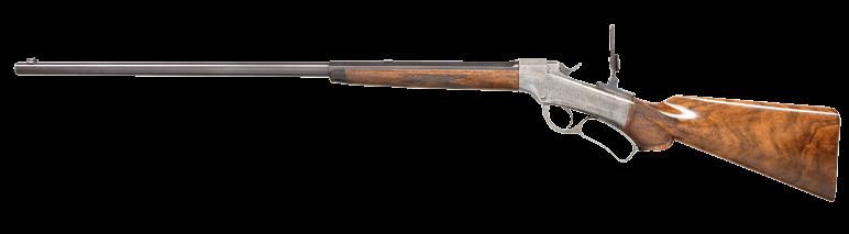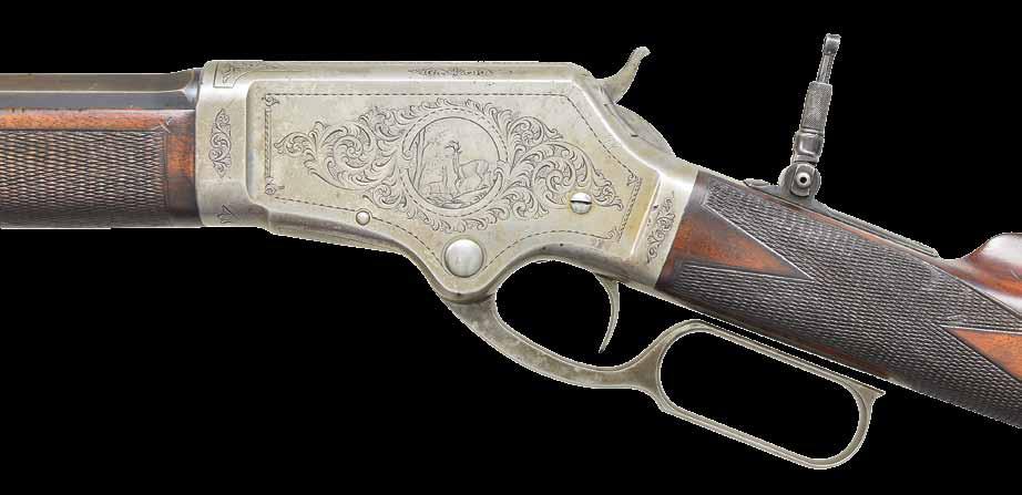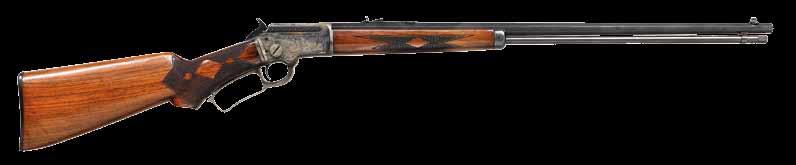 LEVER ACTION RIFLE. Cal. 45-70. S# 126265. Bbl. 24” octagon to round. Lyman no. 4 bead front sight w/ sporting leaf rear sight. Button mag. Action has spectacular unsigned full coverage engraving that closely resembles the factory no. 1 pattern. Right side has an oval vignette above loading gate w/ a stalking mountain lion. Forward vignette wraps around top & front of loading gate w/ a woodland scene featuring a foraging mule deer buck. Left side mountain scene shows a bugling bull elk. Scenes are surrounded by vine type scroll w/ punch dot backgrounds & fancy borders that continues to upper receiver & tangs. Bottom of action has complimenting scroll engraving. Borderline engraving is found on the forearm cap. Blue finish w/ case colored hammer & lever. Walnut forearm & hard rubber capped pistol grip stock of XX grade walnut w/ style H hand checkering. LOP: 13 9/16” over a solid red Silvers pad. Left inside of lower tang is marked w/ assembly number “26” w/ wood grade marking “XX”. Top tang channel of stock has matching assembly number “26”. UNATTACHED ACCESSORIES: letter from Cody Firearms Museum detailing the following information, “Rifle. 45/70 caliber. Barrel Length: 24 inches. Barrel Shape: 1/2 Octagon. Plain trigger. Fancy checkered stock w/ pistol grip & forearm. Sights: Klyman Hunting front sight. 1/2 magazine. Silver’s Recoil Pad. “Polished Receiver”. “Without Finish”. Received in warehouse on August 28, 1902. Shipped from warehouse on August 29, 1902, Order number 149892. Return & Repair November 25, 1902 #168018. Return & Repair June 25, 1903 #189562”. CONDITION: bbl. & action retain over 70% dull fading blue showing carry & edge wear. Lever & hammer show small amounts of case colors in protected areas. Sanded & refinished wood show marks & small dents w/ weakened checkering. Stock has small chips on both sides of top tang. Bore has a lightly frosted appearance over sound rifling. (01-24193/DS). ANTIQUE. $30000-40000.