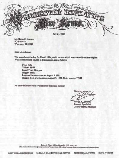 at the breech. Tang bears the proper early pattern marking “MODEL 1894/ -WINCHESTER-/ PAT. AUG. 21 1894.”. Metal components exhibit a blued finish, with the lever having been case color hardened. Furniture consists of smooth fancy wood buttstock and forend. Wood furniture has been lightly sanded and revarnished at one time. German silver tipped blade front sight with with dovetailed semi-buckhorn V-notch rear sight. UNATTACHED ACCESSORIES: Cody Firearms Record Office letter indicating that this rifle’s serial number was applied on February 26th of 1898, and was both received and shipped from the warehouse on June 1st of 1895. CONDITION: metal components retaining large amounts of their original factory blue finish, exhibiting moderate wear and thinning overall that shows through to a pleasant brown patina, with mild moderate surface oxidation present overall. Lever retains good amounts of its original factory case color hardened finish. Bright bore, exhibiting mild pitting and good rifling throughout. Wood furniture show scattered marks and minor impressions from storage and handling, but otherwise is present very nicely overall. An exceptionally attractive first year production Winchester Model 1894 rifle with a 4 digit serial number. (01-23892/MLW).