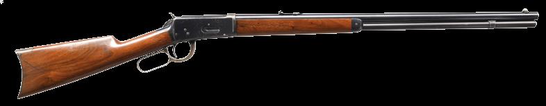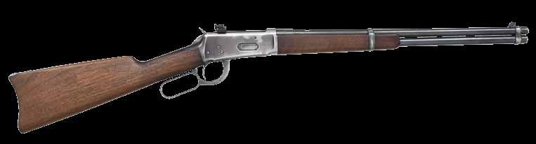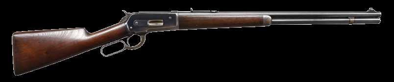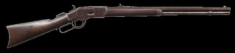 with Winchester’s 2 line address, with the caliber designation stamped at the breech. Brass beaded blade front sight with Marble’s semi-buckhorn U-notch rear sight, and tang mounted aperture rear sight. Full length magazine tube. Plain wood straight grip buttstock with crescent buttplate, with a plain wood forend. Lever is a replacement. CONDITION: frame exhibits a gray patina overall, with some areas of striations from cleaning. Barrel and magazine tube exhibit wear and thinning to their original factory blue finish, that shows through to a pleasing brown patina. Bright bore, exhibiting mild pitting in the grooves and retaining strong rifling throughout. Wood furniture shows scattered marks and minor impressions from storage and handling, but otherwise remains sturdy and serviceable. Forend bears a small loss on the right rear corner. (23-3046/MLW). CURIO. $1,500-2,500.