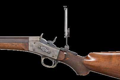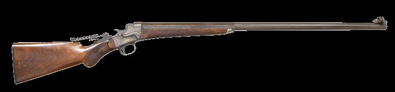 retaining a Marbles 894L front sight. Left side of receiver is mounted with a saddle ring. Receiver and buttplate have been cleaned and are in-the-white. Furniture consists of a solid wood buttstock and forend. CONDITION: metal components retain fair amounts of their original finish, with the majority of components exhibiting wear through to gray patina or being in-the-white from cleaning. Bore is bright, exhibiting moderate amounts of light pitting and fair rifling throughout. Wood furniture shows some scattered marks and minor impressions from storage and handling, with a small gouge on the top left side of the buttstock. (23-2387/MLW). CURIO. $700-1,100.