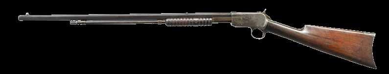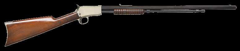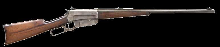 stamped with Winchester’s 2 line address, with the caliber designation stamped at the breech. Aftermarket blade front sight with modified brass tip, and reblued Marble’s semi-buckhorn U-notch rear sight. Forend nosecap has been mounted with a sling swivel. Plain straight grip wood buttstock with crescent buttplate, and plain wood forend. Stock has been sanded and revarnished at one time. CONDITION: frame retains traces of its original factory blue finish, with the balance exhibiting a gray patina overall. Barrel and magazine tube, exhibiting wear and thinning overall that shows through to a pleasant brown patina. Bore is bright, exhibiting scattered pitting and fair rifling throughout. Wood furniture shows some scattered marks and minor impressions from handling and storage, but otherwise remains sturdy and serviceable. (23-3045/MLW). CURIO. $1,000-1,500.