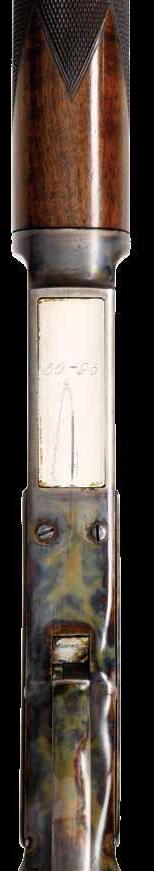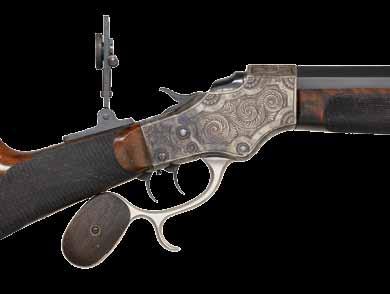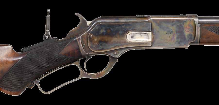 with very minor handling marks and rubs. Barrel markings are sharp. Receiver retains 85%+ original blue thinning at carry points, on relief engraving high points and along receiver edges showing as a mellow aged patina under strong light. Some very light scattered pinprick oxidation on the loading gate and bolt. Hammer and lever retain much of their original case colors with the balance somewhat muted. The highly figured walnut stock and forearm are very fine and retain 95% of the original piano finish with a few light scattered handling marks. Carved spades and checkering panels remain sharp. There is an extra hole in the top tang that accommodates the Lyman 1884 Pt’d tangsight. Engraved screw heads are unmarred. Mechanics are crisp. Bright bore with sharp rifling. A wonderful Colorado “Barn Find” with absolute rock solid provenance.