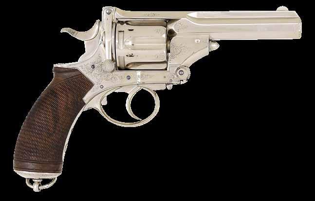 4038. EXTRAORDINARILY RARE “INSIDE NICKEL” FINISHED SPECIAL ORDER WINCHESTER 1876 DELUXE EXPRESS LEVER ACTION RIFLE. Cal. 50-95 Express. S# 39678. Of the 63,871 Model 1876 Winchesters manufactured, an approximate number of only 3,300 were produced in this caliber according to Herbert Houze’s book on the Winchester 1876 of which only 84 were Deluxe checkered rifles (pg. 189). Bbl. 24” round. Fine bead replacement front sight, dovetail for rear sight, Lyman aperture tang sight w/ finely knurled staff. Button mag. Case colored action features an extremely rare factory nickel finish on inside action parts including lifter, breech block, firing pin & loading gate. Dust cover is marked “WINCHESTER EXPRESS / .50 CAL. 95 GRS”. Forearm & S curved pistol grip stock w/ ebony insert of fancy XXX black walnut. Features include style “H” hand checkering & steel shotgun buttplate. Both sides of stock are stamped “M.D. EWELL”. Inside left of lower tang is marked w/ assembly number “1850” followed by wood grade marking “XXX” & “S”. Top tang channel of stock & back of buttplate have matching assembly number “1850”. Inside of forearm bbl. channel has matching pencil-marked number “1850”. UNATTACHED ACCESSORIES: Cody