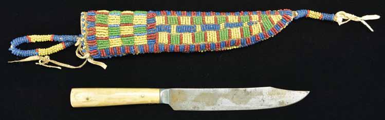 x 2”, sinew sewn, full coverage on one side with dark green, light green, navy blue, and white-heart red beads on white ground, reverse has three crosses with same palate, beaded drop. 7” “Forgecraft” utility knife. CONDITION: very good overall, beading appears complete. PROVENANCE: From the Lifelong Collection of Glen E. Mattox. (02-18349/JS). $600-800.