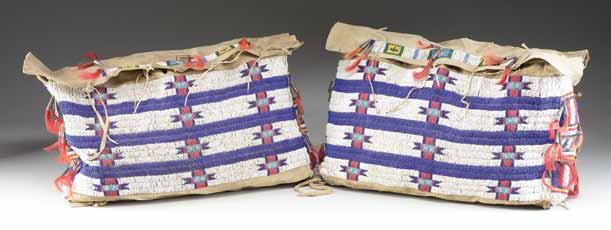 4598. VERY FINE & RARE MATCHING PAIR OF NATIVE AMERICAN BEADED DECORATED TIPI BAGS. Each about 18” x 10” x 5” tanned leather, totally beaded faces, and sides made with geometric design of whiteheart red, greasy yellow, sky blue, & green beads with thick dark blue bars on white ground. Additional ornamentation with dyed horsehair and tinkle cones. Mr. Mattox tag states circa 1890. Palette and design points towards Central Plains, at least one similar bag is identified as Cheyenne. Similar bags are found several institutional collections, it’s rare to find a matched pair especially in such fine condition as these. CONDITION: fine, appears complete, supple, minor staining & soiling. PROVENANCE: From the Lifelong Collection of Glen E. Mattox. (02-18733/JS). $1,500-2,500.