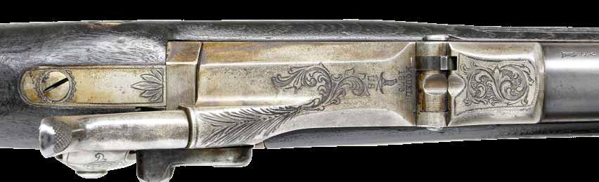 rear sight. CONDITION: metal components exhibit a gray patina, with areas of mild pitting and darker discoloration overall. Bore is bright, exhibiting consistent pitting and strong rifling throughout. Wood furniture shows scattered marks and impressions from handling and storage, with a minor loss at the top of the comb, but otherwise remains sturdy and serviceable. (01-24160/MLW). ANTIQUE. $2,000-3,000.