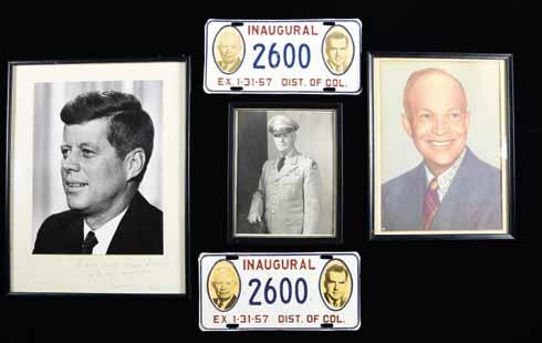 PHOTOGRAPH, PART OF GROUPING FROM MAJ. GEN. WM. H. ABENDROTH. William H. Abendroth (1895-1970) had a very long military career starting with Idaho National Guard and he participated in the hunt for Pancho Villa, later service in France in World War 1 and various high ranks in National Guard, he retired as major general and was commander of the District of Columbia National Guard where he was acquainted with presidents Eisenhower and Kennedy. Both presented him with signed photographs. John F Kennedy’s presentation photographs are unusual and scarce. He obviously wrote this one in person in his awful handwriting, which is hard to decipher holography. It is massive on 18” x 14” board with 13” x 10.5” silver print photo attached, presentation appears to read: “To Major General William Abendroth / with my good wishes / John F Kennedy / January 19, ‘61 USA” which is day before his inauguration as president. The 14” x 10” color image of Eisenhower is signed on collar “To General Abendroth / with best wishes / Dwight D Eisenhower”. The 8” x 10” photo of Abendroth in Major General uniform is signed “Maj. Gen. W. H. Abendroth”. Abendroth was awarded the Army Distinguished Service Medal, he is buried in Arlington Cemetery. Also in this lot are a pair of official 1957 presidential inaugural license plates with vignettes of Eisenhower & Nixon, most likely registered to General Abendroth. CONDITION: good overall, the three framed photographs all have some minor light fading, but good contrast and strong dark ink on both the Kennedy and Eisenhower photographs. PROVENANCE: consigned by General Abendroth’s grandson. (02-22284/JS). $2,000-4,000.