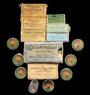 4689. LARGE QUANTITY OF VINTAGE AMMO BOXES. Several vintage empty ammo boxes (47 total) including 9 green & red, Remington UMC Kleanbore .45 Colt, 12 green & red Remington Kleanbore 44 Winchester (44-40), 11 green & red Remington Kleanbore 38 Winchester (38-40), 3 green & red Remington UMC Oilproof 44 S&W American, 10 blue, yellow & red Western 32 Short rim fire, 1 blue, yellow & red Western 45 Colt Lubaloy & 1 green & red Remington Oilproof 32 S&W long centerfire. CONDITION: Most boxes are readable, & solid, retaining their original shape. Some scratches & rolls but few tears w/ most retaining their structural integrity. (02-21088./JZ). NONGUN. $400-600.
