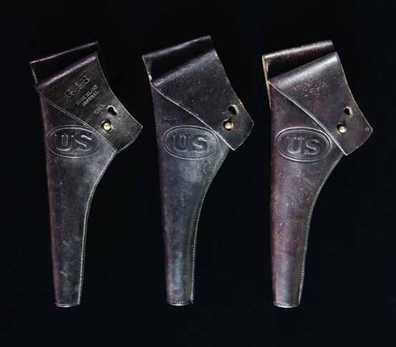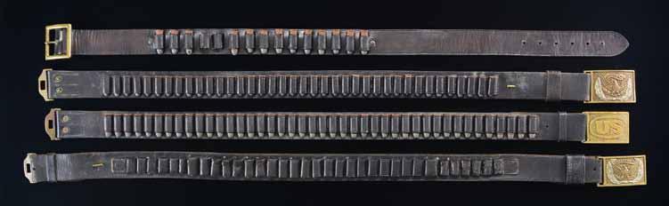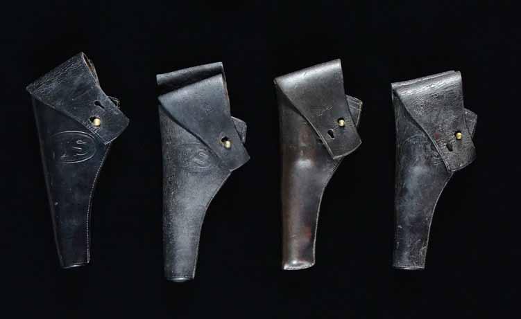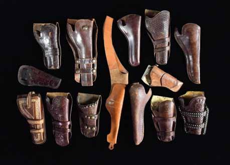 4679. HIGH GRADE MODERN LEATHER BELTS, HOLSTERS, & MORE. This lot includes 1 pistol cartridge belt in cream & brown leather, marked “42” & “SAN PEDRO SADDELRY TOMBSTONE”. The belt is complete with two brown leather pistol holsters. / 1 White canvas & black leather shotgun cartridge belt, marked “36” & “DILLON MAKER ARIZONA TERRITORY”. / 1 Dark brown leather shotgun shell & pistol belt, marked “MURPH’S CUSTOM LEATHER CHINA GROVE, NC.” / 1 Black leather pistol belt with silver star-in-circle decoration, marked “THE CARVER”. Belt is complete with two black leather pistol holsters with similar star-in-circle design. / 1 Brown leather & white canvas small women’s or child’s shotgun shell & pistol belt. / 1 Brown leather decorated pouch with black trim to fit on a belt. / 1 Brown leather belt pouch with three compartments. / 1 Brown leather pistol belt with silver floral conchos & matching holster. Belt & holster are well-made but unmarked. / 1 Pair of brown leather cuffs with tooled decoration. / 1 Black leather belt pouch with starin-circle decoration. / 1 Brown leather pistol holster with black trim. / 1 Brown leather pistol holster with silver concho decoration.