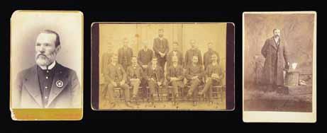 1) City Marshall, Mexico, Missouri, cabinet card, bearded subject wearing large “CITY SHERIFF” marked badge. CONDITION: good contrast in detail heavily scuffed edges specially on bottom left corner. 2) 8” x 5” lengthwise view of jurors & Sheriff Robert E. Lindsay; all identified on Verso, trial lasted several weeks before a guilty plea was found in the murder trial, Hallidays Cove, WVM, May 9, 1887. CONDITION: image is good overall with soiling and staining. 3) Hamburg, Iowa back marked cabinet card of unidentified lawman wearing star badge. Subject appears to be missing his left hand appears as a nub resting on unknown contraption on table at his side, interesting content. CONDITION: good overall, about half inch chip in emulsion, soiled. PROVENANCE: Martin Lane Historic & Western Americana Lifetime Collection. (02-21969/JS). $300-400.