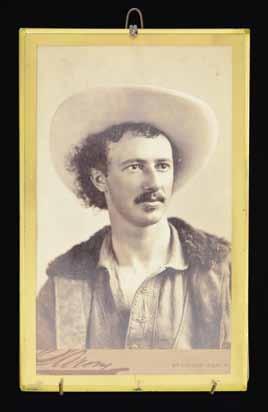 4643. FINE SCARCE CABINET CARD PHOTO OF “CAPTAIN JACK” OMOHUNDRO. 1875 dated Sarony cabinet card in gilded cabinet card mount. John Baker “Cpt. Jack” Omohundro (1846-1880), born in Fluvanna Virginia, was Confederate cavalryman with Jeb Stuart, frontier scout during Indian Wars, cowboy and actor. Before his untimely death at age 39, Texas Jack became a legendary figure in the Old West as a Western showman performing dramas on the stage throughout the country and was immortalized in dime novels published around the world. He is buried in Leadville, CO. CONDITION: very good, good spring loaded specialty beveled glass mount. PROVENANCE: Martin Lane Historic & Western Americana Lifetime Collection. (0221670/JS). $400-600.