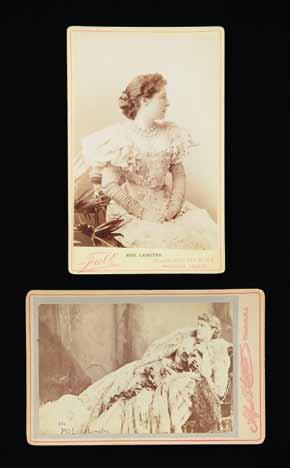 4664. PAIR OF SCARCE CABINET CARD PHOTOS OF LILLY LANGTRY. Two fine Victorian photos of the elegant Miss Lilly Langtry (1852-1929) who Judge Roy Bean named the town of Langtry, TX after in 1882. As famous as she was, her images from this era are quite scarce. CONDITION: very good. PROVENANCE: from Martin Lane Historic & Western Americana Lifetime Collection. (0221989/JS). $400-600.