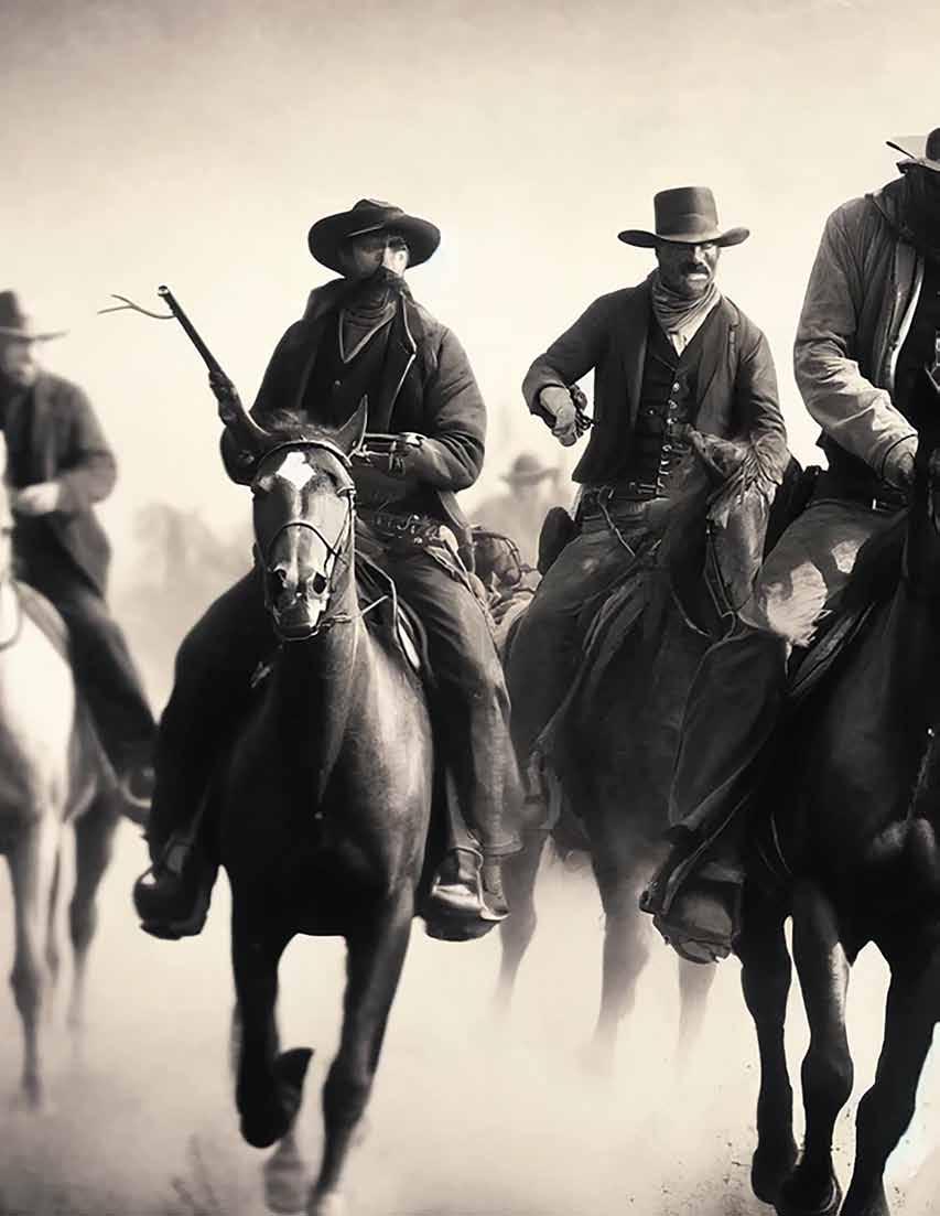 4676. GOOD TINTYPE OF TWO COWBOYS HOLDING COLT SAA REVOLVERS. 3.75” x 2.5” loose plate clean & clear, scarce image of real working cowboys both dressed up for this photo with ties, both wearing Stetson style hats, seated cowboy has military eagle sword belt buckle & cowboy boots. Standing cowboy is wearing a single loop cartridge belt. Both pose with Colt single action army revolvers across their chests. CONDITION: very good. PROVENANCE: Martin Lane Historic & Western Americana Lifetime Collection. (02-21917/JS). $300-500.