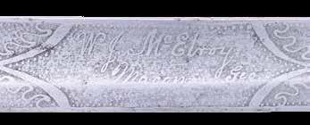 4462. 3 MID 1800s BELT KNIVES. 1) Overall length: 12 3/4”. Blade length: 7 3/4”. The spear point blade has a raised medial ridge and is marked near the spine “WOSTENHOLM & SON WASHINGTON WORKS SHEFFIELD.” The knife is also marked at the ricasso “I X L”. Elliptical German silver guard with a 2-piece stag grip. The grip is held in place by 5 pins on each side. The front grip has a 1 5/8” unengraved escutcheon. The sheath has a German silver collar with a button frog stud. There is no tip present. The leather body has embossed gold edging and embossed letters “I * X L”. CONDITION: blade has a gray patina and shows evidence of kind sharpening. The hilt shows light wear overall. Sheath body shows significant wear with some minor loss of leather. 2) Overall length: 11 1/4”. Blade length: 5 3/4”. The spear point blade has a 3 1/2” pseudo false edge and is marked at the ricasso “R. McQUEEN & SON NEWCASTLE”. Lobed German silver guard with 2-piece crosshatched certifiably antique ivory grips. The grips are held in place by 4 pins on each side. The sheath has a German silver collar with a button frog stud and a similar tip. The leather body has embossed Greek key edging on both sides. CONDITION: blade has a light gray overall patina. Hilt shows light wear. Sheath body shows abrasions but no losses or breaks. 3) Overall length: 13 1/8”. Blade length: 8 1/8”. The spear point blade has a raised medial ridge and is marked on the ricasso “SOUTHERN & RICHARDSON SHEFFIELD.” Elliptical German silver guard with a 1-piece horn grip. The grip has 2 carved decorative bands and 3 silver inlays being a royal crown, the hand of Ulster, and a Tudor rose. The sheath has a German silver collar with the button missing. The red Moroccan leather body is embossed on the edges of both sides in gold leaves and there is a leaf flourish in the center of the front. CONDITION: the blade has a medium gray patina with some staining but no pitting. The grip shows a few minor insect tracks and drying cracks. The sheath is missing its tip and the leather is a bit cracked and abraded. (02-24310-1/BF). $800-1,300.