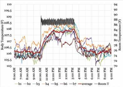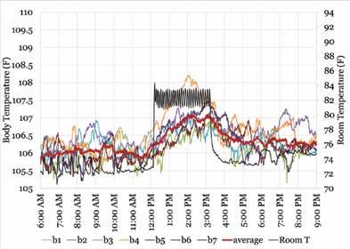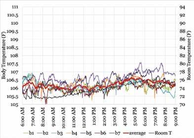 mately 74 degrees F, except during specific 2- to 6-hour intervals when it was raised to 82 degrees F, 87 degrees F, or 92 degrees F. Throughout the seven-day study, room temperature, relative humidity, and bird body temperatures were recorded every minute. Figure 1 shows the body temperatures of the seven broilers on the first day of the study (6:00 a.m. to 9:00 p.m.), where an air temperature of 74 degrees F – 76 degrees F was maintained. During this period, body temperatures remained relatively stable, ranging from 106 degrees F to 106.5 degrees F — within the normal range for broilers, as reported in previous research.