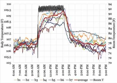 On the third day of the study, the room temperature was raised to 87 degrees F between 10 a.m. and 3:30 p.m. (Figure 3). This time, the average bird body tem-