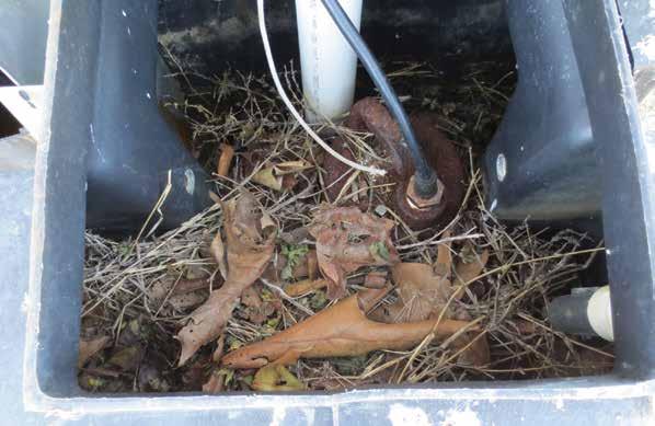 Photo 1 shows a sump and cooling pump covered with grass and leaves. Photo 2 shows the end of an evaporative cooling trough that is full of grass. Both of these systems need a quick cleaning and debris removal to prevent a malfunction.