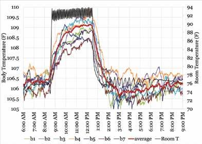 On the fourth day, the room temperature was increased to 92 degrees F from 10:30 a.m. to 12:30 p.m. (Figure 4). As expected, the higher room temperature resulted in a greater increase in body temperature (109 degrees F). A body temperature of 109 degrees F would likely have a