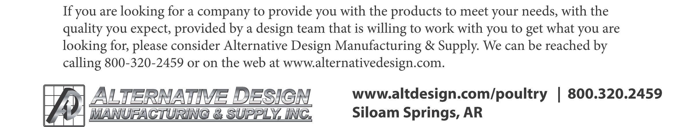 With over 35 years’ experience, Alternative Design’s sales team is always available and willing to discuss the needs our prospective and current customers have for poultry housing products. The highly skilled engineering team is continuously focused on designing products with durability and functionality in mind to help clients achieve the results they need. Our trained service and installation teams are dedicated to meeting the customer’s needs and are willing to visit with a customer about any of our products. Whether the needs are production based or researchoriented, the quality of Alternative Design’s products is evident in the longevity and durability of their products, with many products still in use some 35 or more years later.