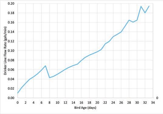 Figures 1 and 2 illustrate the average daily drinker line flow rate as well as the average and maximum water velocity at the beginning of the drinker line. The sudden drop in flow rate and velocity on Day 8 was due to the birds transitioning from halfhouse brooding into the full house, thereby having access to twice the number of drinker lines