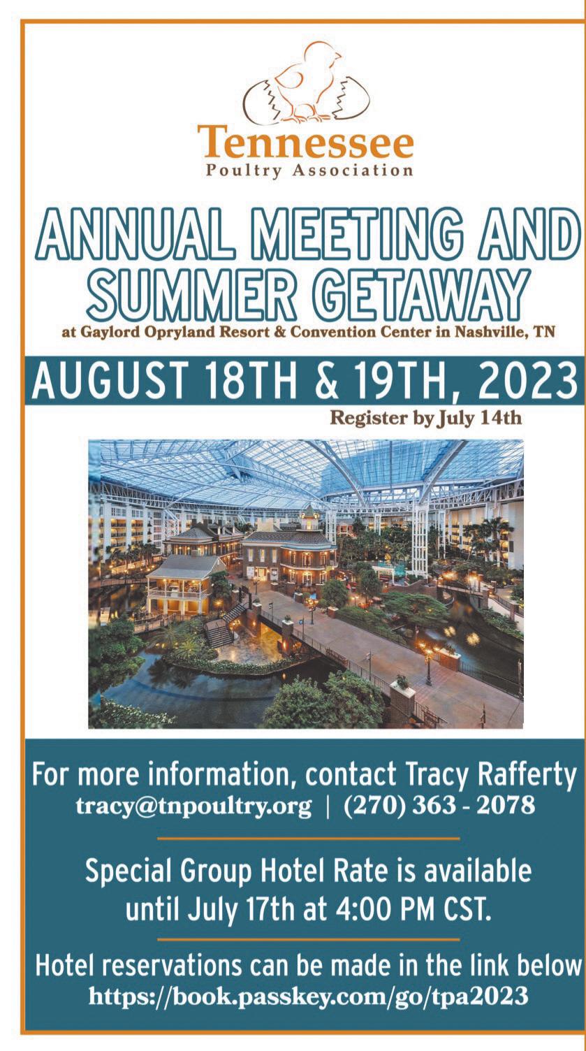AUG 18-19 — TPA ANNUAL MEETING & SUMMER GETAWAY, Gaylord Opryland Resort, Nashville, Tenn. Contact: Tennessee Poultry Association, P.O. Box 1525, 1404 N. Main St., Shelbyville, Tenn. 371621525; Ph: 931-225-1123; info@ tnpoultry.org; www.tnpoultry.org.