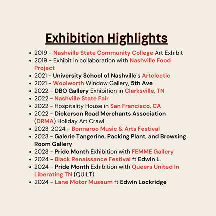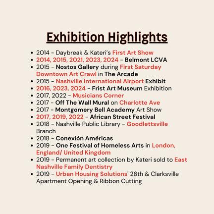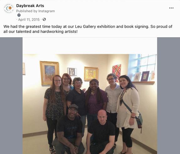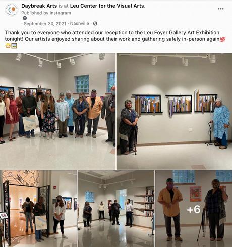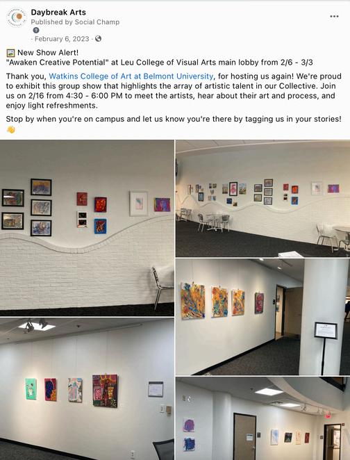 From January-February 2024, we exhibited at the Leu Center for Visual Arts at Belmont University with a reception and panel In May 2024, we started our new ongoing exhibition at Henricksen Design From May-June 2024, our artists exhibited at the Frist Art Museum for our annual Community Partner Art Show In June 2024, we partnered with QUILT (Queers United In Liberating TN) to host a collaborative Pride Month Art Show featuring works by both Daybreak Artists and QUILT Artists