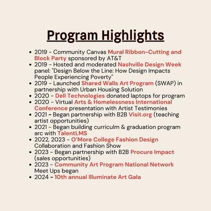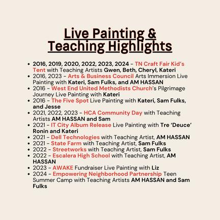 To facilitate teaching artists opportunities by our artists in '23-'24, we partnered with for-profit businesses like HCA Healthcare in April '24 (Teaching Artist, AM HASSAN) and nonprofit events like the Fall ‘23 (Teaching Artists, Liz) and Spring ‘24 (Teaching Artists, Cheryl and Beth) TN Craft Fair Kid's Tent.