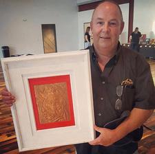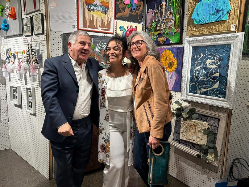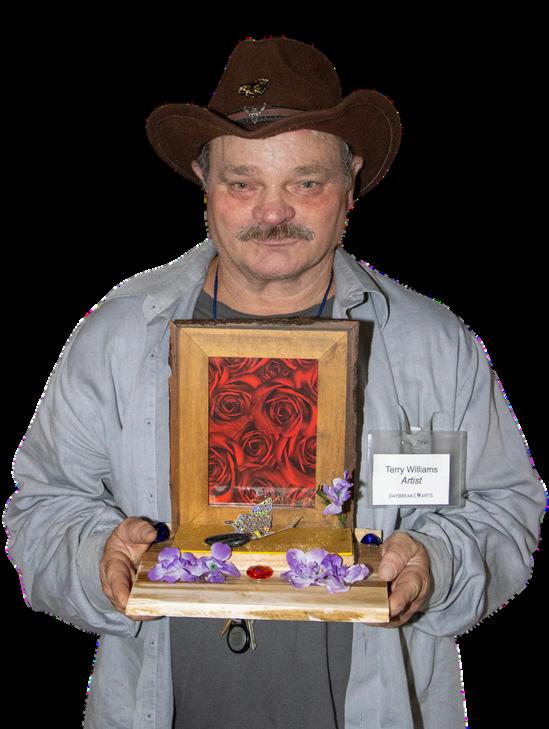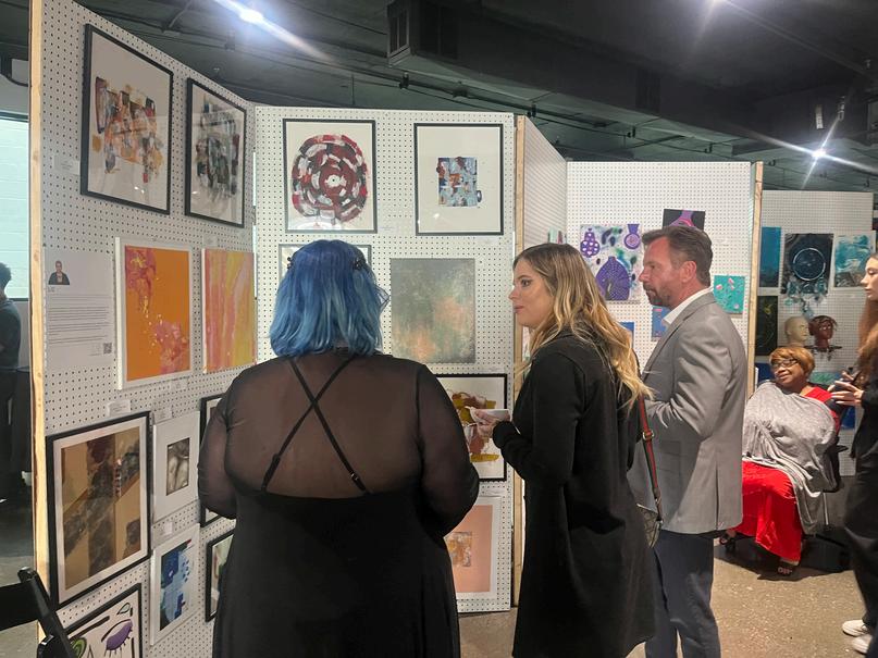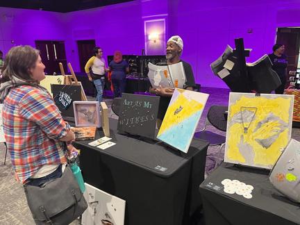 Throughout July-September 2023, we worked with community partners like Room in the Inn to onboard new artists all of whom worked throughout the summer toward their debut at our inaugural New Artist Showcase in November 2023. Shane and Terry were able to complete all of the steps to participate in the New Artist Showcase, and Terry exhibited at the 2024 Illuminate Art Gala (pictured right).