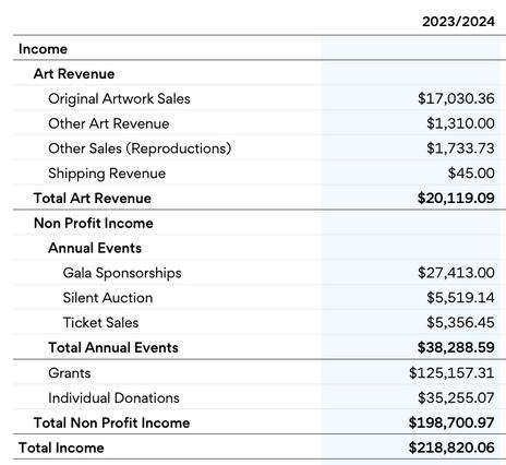 As our organization grows, we continue to expand the number of ways our artists can earn income through their creative talents. We're proud to share that our total revenue this past year in this category was $1,310 and included teaching, live painting, and IP licenses.