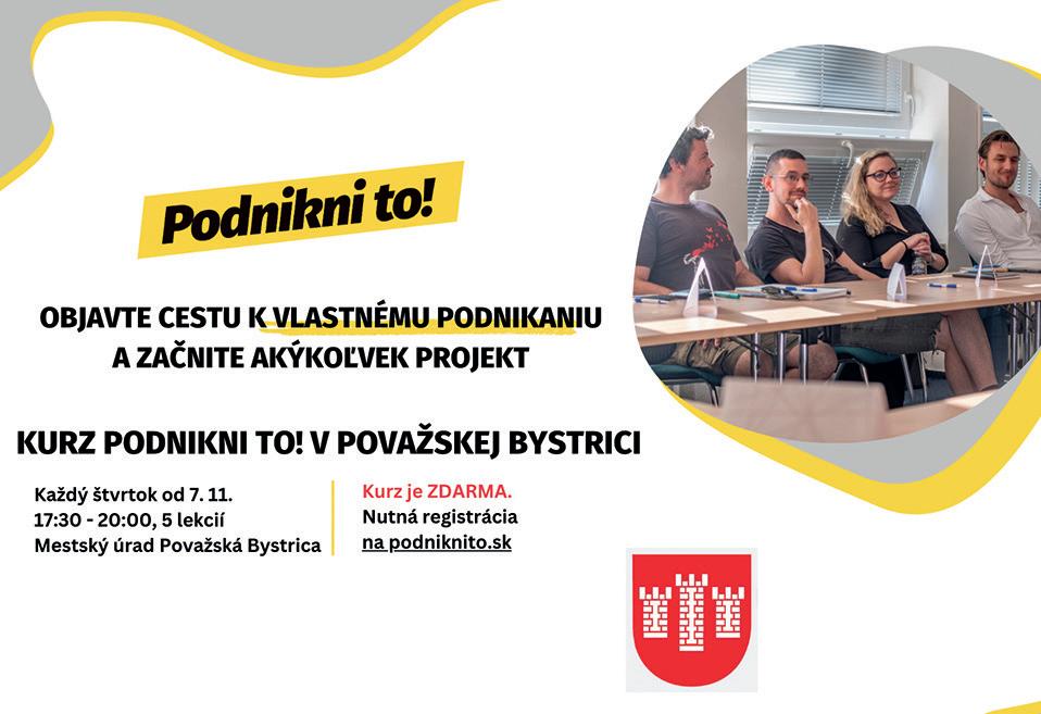 Mesto Považská Bystrica v spolupráci s projektom Podnikni to! ponúka svojim občanom bezplatný kurz, ktorý im pomôže premeniť ich podnikateľskú víziu na skutočnosť. Naučia sa ako nájsť podnikateľské príležitosti a postupne ich premeniť na úspešné a ziskové projekty. Prví záujemcovia sa môžu prihlasovať až do 11. októbra.