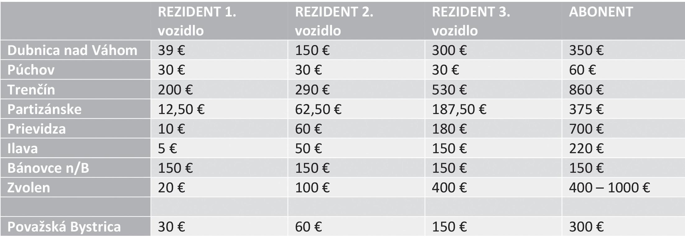 PREHĽAD CIEN PARKOVACÍCH KARIET – MESTÁ V TRENČIANSKOM KRAJI + ZVOLEN