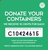 Please take glass, plastic, aluminium, steel and paper-based cartons between 150mL and 3L to your local refund depot, and use the Perth Observatory (Scheme ID: C10424615).