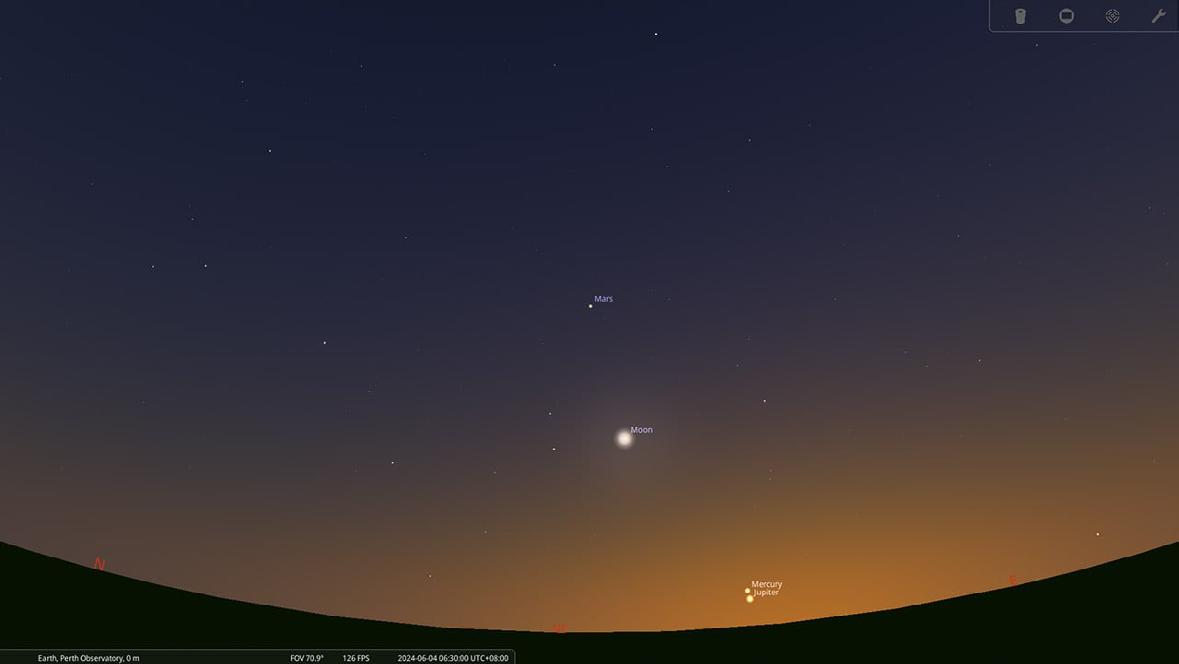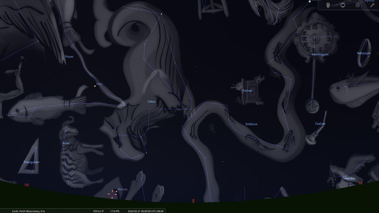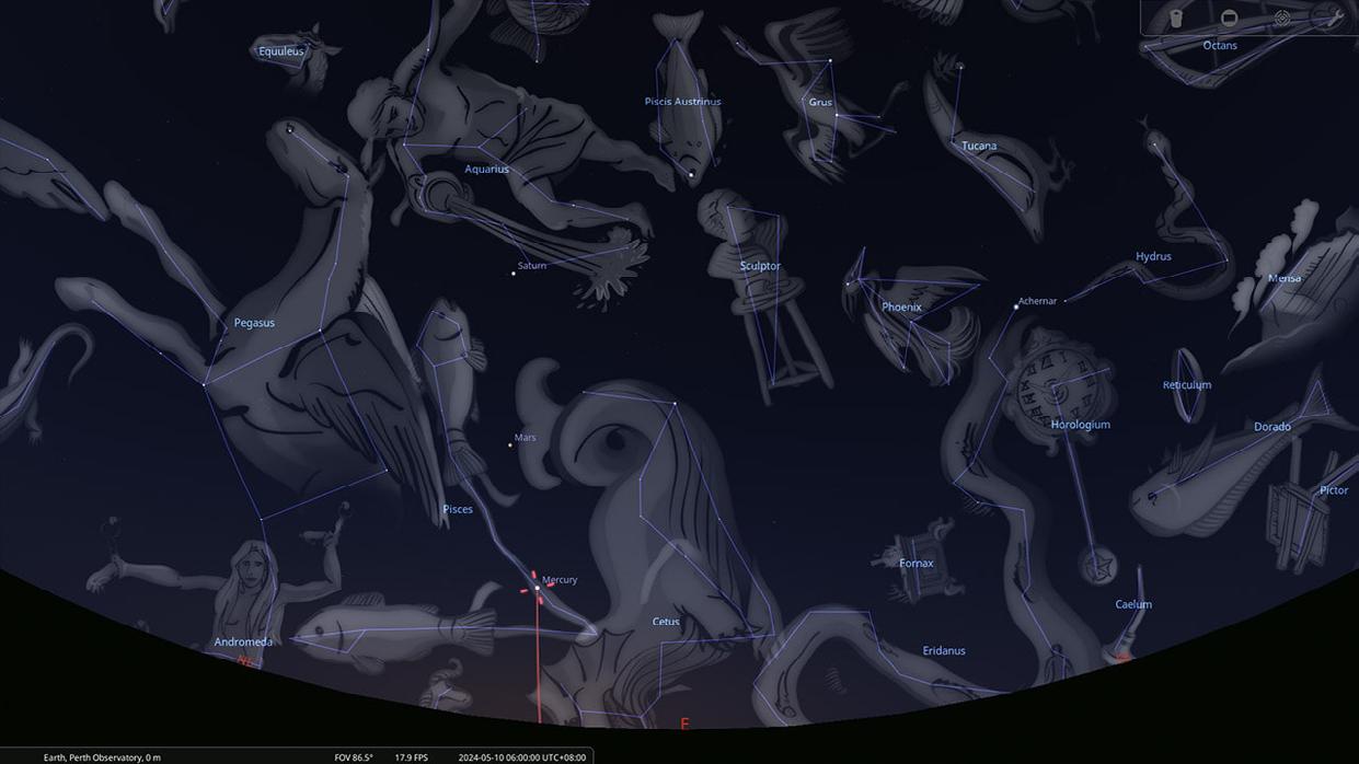 In May, celestial wonders adorn the early morning sky, inviting observers to witness the graceful dance of planets and stars. As dawn breaks, Mercury emerges in the eastern horizon, nestled amidst the constellations of Pisces (The Fish), and Cetus (The Sea Monster). As the month unfolds, Mercury’s celestial voyage through the sky leads it into the constellation of Taurus (The Bull), In the second week, Mercury reaches its greatest elongation in the western sky on Monday, May 10th, before retracing its path towards the radiant glow of the Sun.