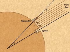 With this information, he was able to calculate the circumference of the Earth. His exact answer is unknown; because nobody knows the exact length of the distance units he used (called “stadia”). He may have gotten it right to within 1%, or he may have been off by about 16%. Either way, his answer was pretty good... and he was the first person to make a good measurement of the size of the Earth! He was also the first to calculate the tilt of the Earth’s axis (again with remarkable accuracy).