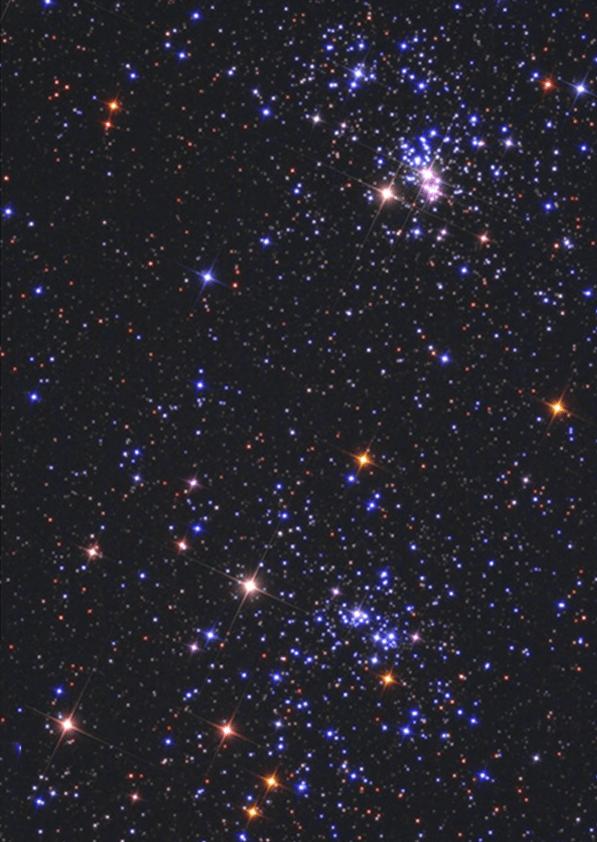 NGC 869 has a mass of 3700 solar masses and NGC 884 weighs in at 2800 solar masses; however, later research has shown both clusters are surrounded by a very extensive halo of stars, with a total mass of the cluster of at least 20,000 solar masses. There are estimated to be more than 300 blue-white super-giant stars in each of the clusters. Their hottest main sequence stars are of spectral type B0. A truly spectacular sight!