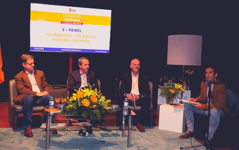 No segundo painel, “Autarquias - Os novos poderes centrais” estiveram presentes, Sérgio Humberto, Presi dente da comissão política distrital do Porto e Presidente da Câmara Municipal da Trofa, Ricardo Rio, Pre sidente da Câmara Municipal de Bra ga, e Alexandre Costa, Presidente do PSD de Paços de Ferreira. Um tema atual, de grande relevância para o futuro dos municípios e que tem estado nos microfones mediatos e políticos nos últimos meses, painel moderado por Álvaro Sampaio.