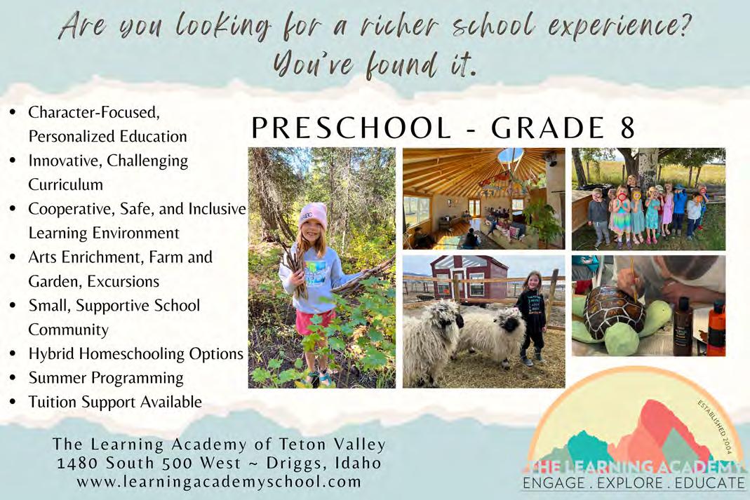 The Learning Academy of Teton Valley is an independent Preschool–Grade 8 school celebrating more than twenty years of excellence in education. Nestled on a beautiful campus featuring a school farm, greenhouse, and yurt, LATV provides a nurturing, child-focused environment that inspires exploration and creativity. LATV encourages students to thrive academically, socially, and emotionally by emphasizing inclusivity and character education. With a commitment to hands-on learning, time in nature, creative play, and individual growth, LATV fosters curiosity and confidence in every child, creating a vibrant, supportive community where students love to learn and grow. Summer programming, hybrid homeschooling options, and tuition support are available. Come see for yourself what a truly rich school experience can be. [p. 27]