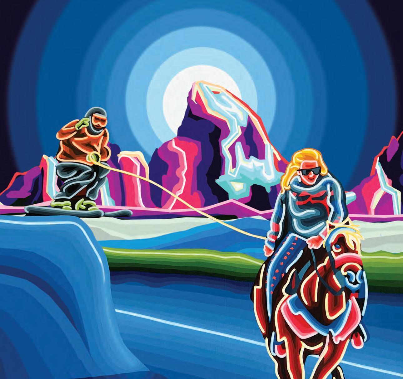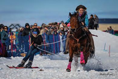 IT’S AN EVENT YOU MUST SEE TO FULLY BELIEVE: A skier holding a rope behind a galloping horse, while flying down a snowy track at full speed and trying to hit jumps and grab rings. “You don’t have to know the rules to get hooked—just show up once, and you’ll get it,” says Bridget Sweeney, Teton Valley Skijoring executive director.