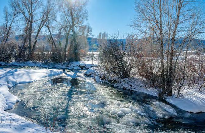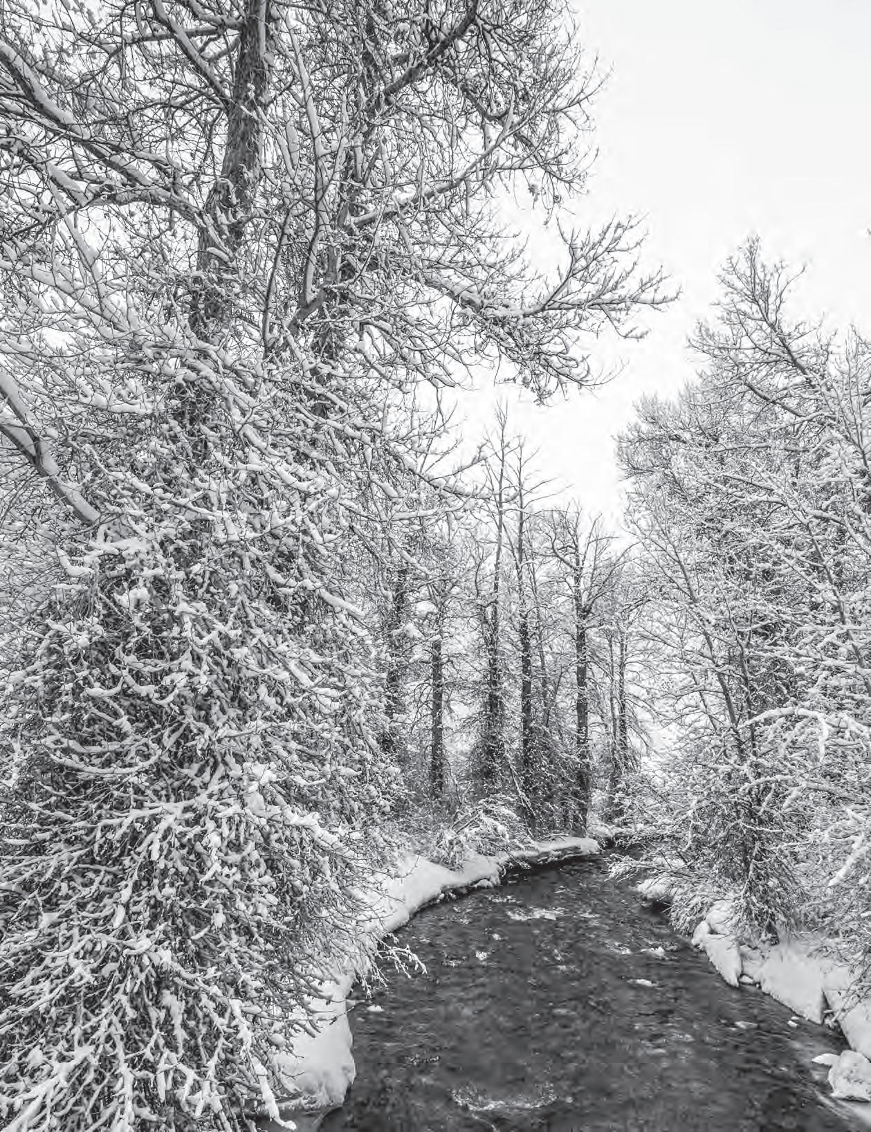 Ryan Ariano deep-dives into the big, bold career of awardwinning videographer and photographer Mark Fisher (page 60), and writer and avid ice climber Brandon Wanthal shares why he seeks out the magnificent frigid ice routes winter after winter (page 88). Closer to home is the quiet, subtle splendor of Trail Creek. Beginning on page 74, photographer Linda M Swope covers this valley lifeline in all seasons, from its months blanketed in frost to the spring sun thaw.