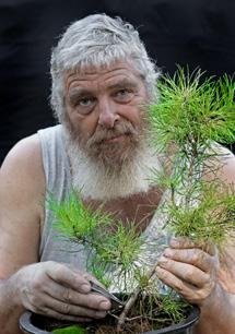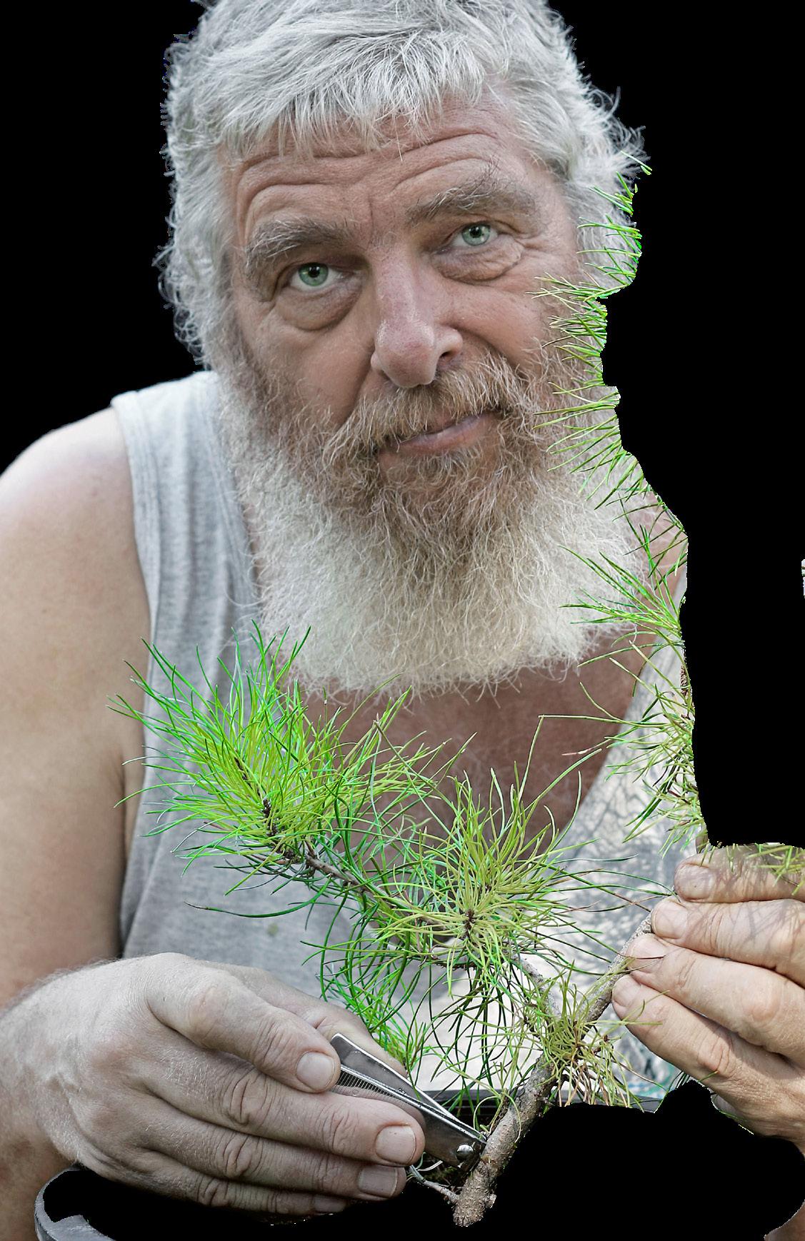 driver John Mayer, photographed by Rick George, snipping his bonsai tree with fingernail clippers. John