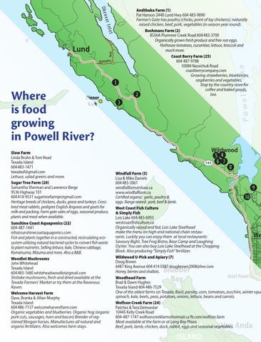 Andtbaka Farm (1) Pat Hanson 2440 Lund Hwy 604 483-9890 Farmer’s Gate has poultry (chicks, point of lay chickens), naturally raised chicken, beef, pork, vegetables (in season year round). Bushmans Farm (2) 8556A Plummer Creek Road 604 483-3700 Organically grown fresh produce and free-run eggs. Hothouse tomatoes, cucumber, lettuce, broccoli and much more. Coast Berry Farm (25) 604 487-9788 10084 Nassichuk Road coastberrycompany.com Growing strawberries, blueberries, raspberries and vegetables. Stop by the country store for coffee and baked goods, too.