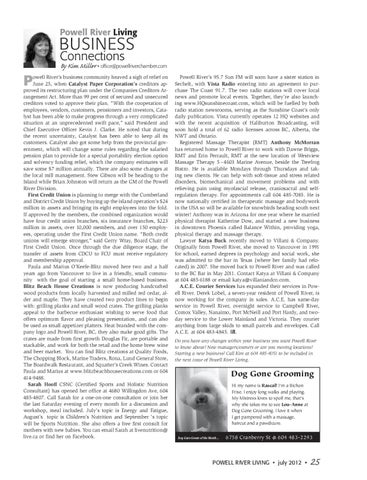 Powell River’s 95.7 Sun FM will soon have a sister station in Sechelt, with Vista Radio entering into an agreement to purchase The Coast 91.7. The two radio stations will cover local news and promote local events. Together, they’re also launching www.HQsunshinecoast.com, which will be fuelled by both radio station newsrooms, serving as the Sunshine Coast’s only daily publication. Vista currently operates 12 HQ websites and with the recent acquisition of Haliburton Broadcasting, will soon hold a total of 62 radio licenses across BC, Alberta, the NWT and Ontario. Registered Massage Therapist (RMT) Anthony McMorran has returned home to Powell River to work with Dawne Briggs, RMT and Erin Perrault, RMT at the new location of Westview Massage Therapy 5 – 4603 Marine Avenue, beside the Treefrog Bistro. He is available Mondays through Thursdays and taking new clients. He can help with soft-tissue and stress related disorders, biomechanical and movement problems and with relieving pain using myofascial release, craniosacral and selfregulation therapy. For appointments call 604 485-7085. He is now nationally certified in therapeutic massage and bodywork in the USA so will be available for snowbirds heading south next winter! Anthony was in Arizona for one year where he married physical therapist Katherine Dow, and started a new business in downtown Phoenix called Balance Within, providing yoga, physical therapy and massage therapy. Lawyer Katya Buck recently moved to Villani & Company. Originally from Powell River, she moved to Vancouver in 1991 for school, earned degrees in psychology and social work, she was admitted to the bar in Texas (where her family had relocated) in 2007. She moved back to Powell River and was called to the BC Bar in May 2011. Contact Katya at Villani & Company at 604 485-6188 or email katya@villaniandco.com. A.C.E. Courier Services has expanded their services in Powell River. Derek Lobel, a seven-year resident of Powell River, is now working for the company in sales. A.C.E. has same-day service in Powell River, overnight service to Campbell River, Comox Valley, Nanaimo, Port McNeill and Port Hardy, and twoday service to the Lower Mainland and Victoria. They courier anything from large skids to small parcels and envelopes. Call A.C.E. at 604 483-4845. Do you have any changes within your business you want Powell River to know about? New managers/owners or are you moving locations? Starting a new business? Call Kim at 604 485-4051 to be included in the next issue of Powell River Living.
