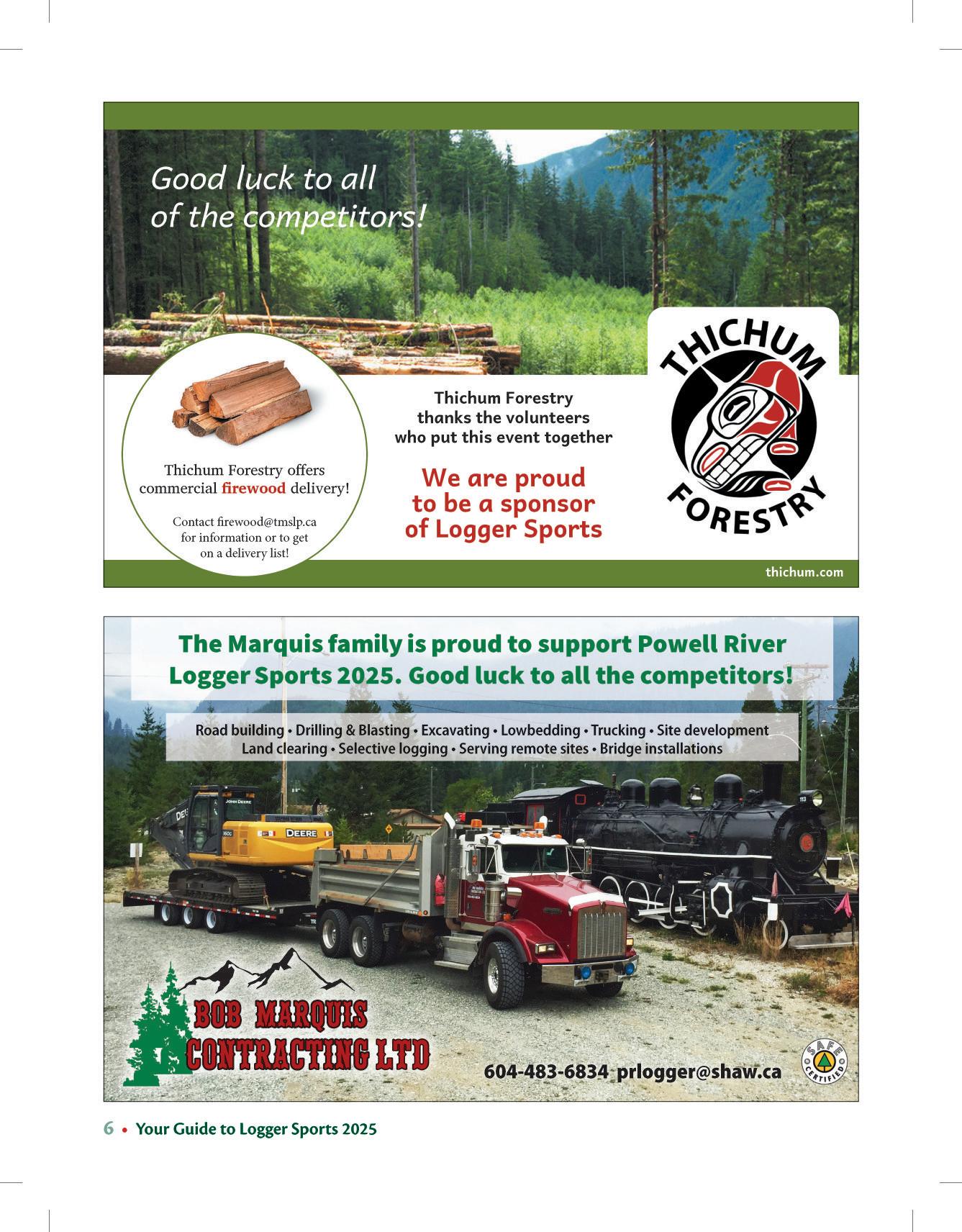 The 2025 edition of Powell River Logger Sports starts July 9 with chainsaw carving. The other main events are held July 12& 13 at the Loggers Memorial Bowl. Read all about the sports and see the schedule inside this issue of Your Guide to Powell River Logger Sports.