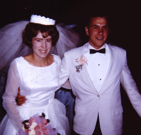 60 YEARS APART: Mary and Glenn Fidler got married at St. David and St. Paul Anglican Church in Townsite September 4, 1965 (left). On September 4, 2025, they stood at the same spot in front of the church, celebrating 60 years married. Mary has been in Willingdon Creek Village for four years and Glenn visits her every day.