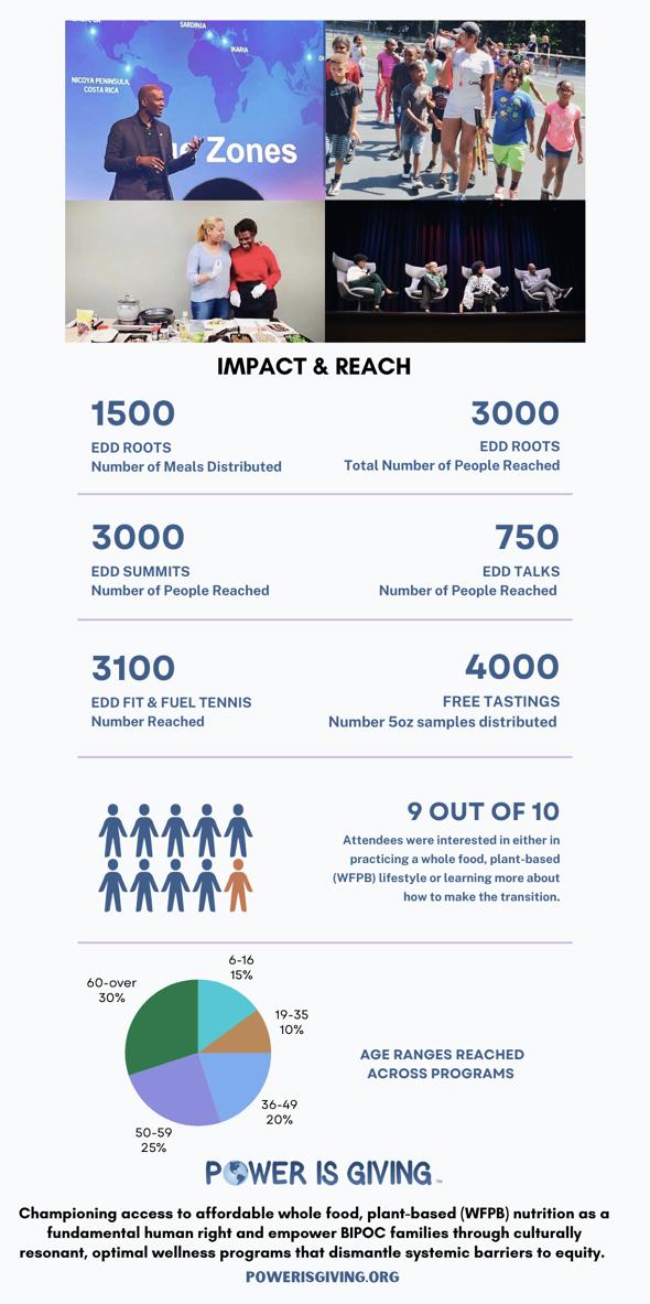 In an effort to transform lives and dismantle systemic barriers to wellness equity, Power is Giving provides whole food, plant-based (WFPB) restoraCve lifestyle educaCon, resources and advocacy with a targeted focus on Black, Indigenous, and People of Color (BIPOC) communiCes.